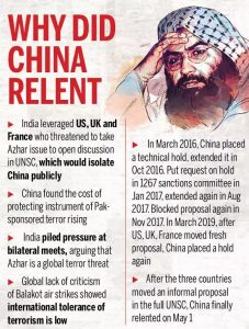 * India’s threat to take the Azhar issue to open discussion in UNSC, also prompted China to yield as it could have isolated China